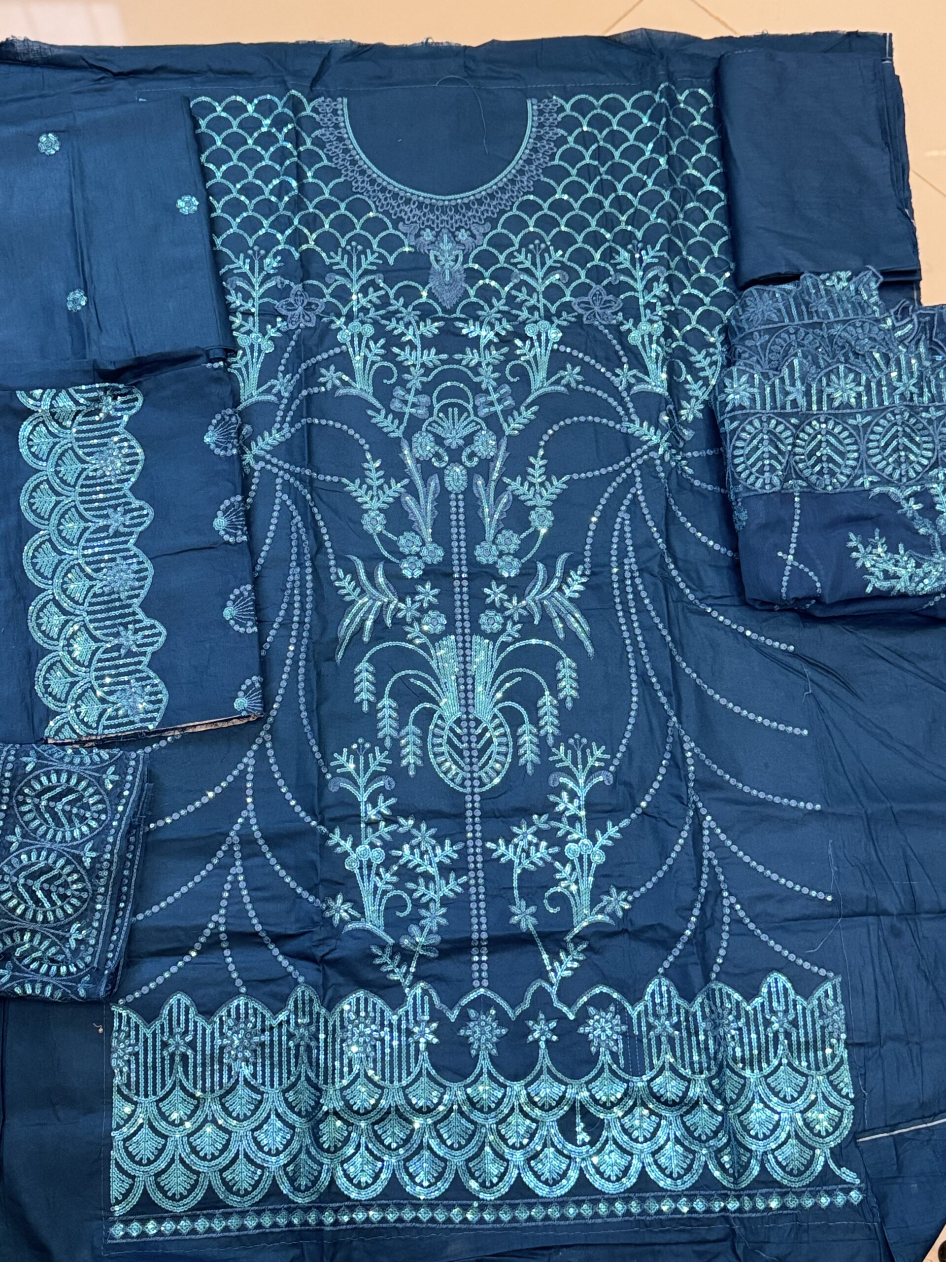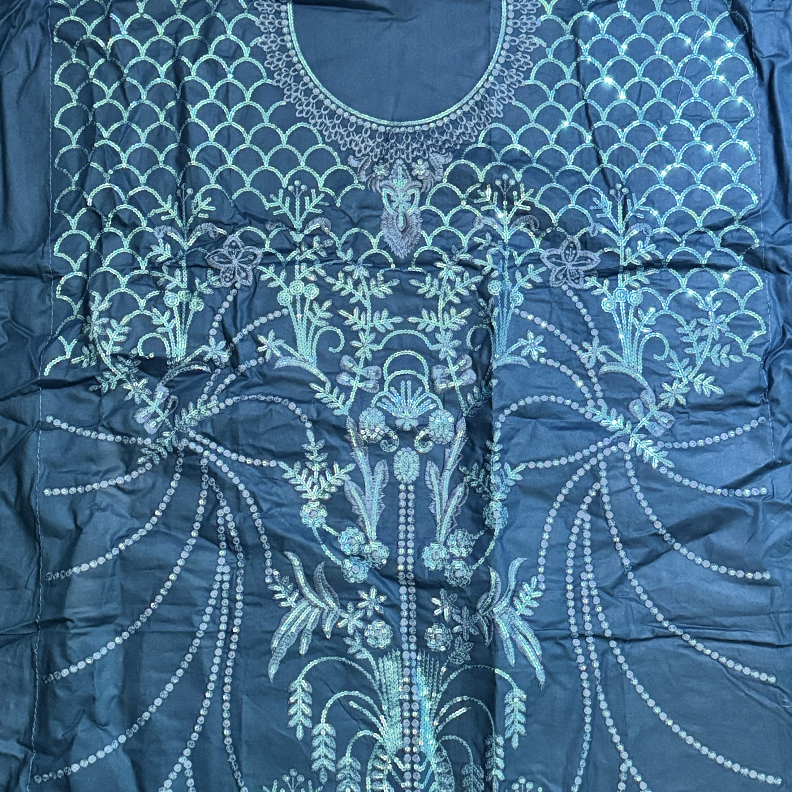 The deep navy base paired with luminous teal threadwork adds a bold yet graceful charm—ideal for women who love refined, high-end ethnic wear. With ample fabric to customize your desired style, this unstitched Maria B. suit promises luxury, comfort, and timeless elegance in every stitch.
