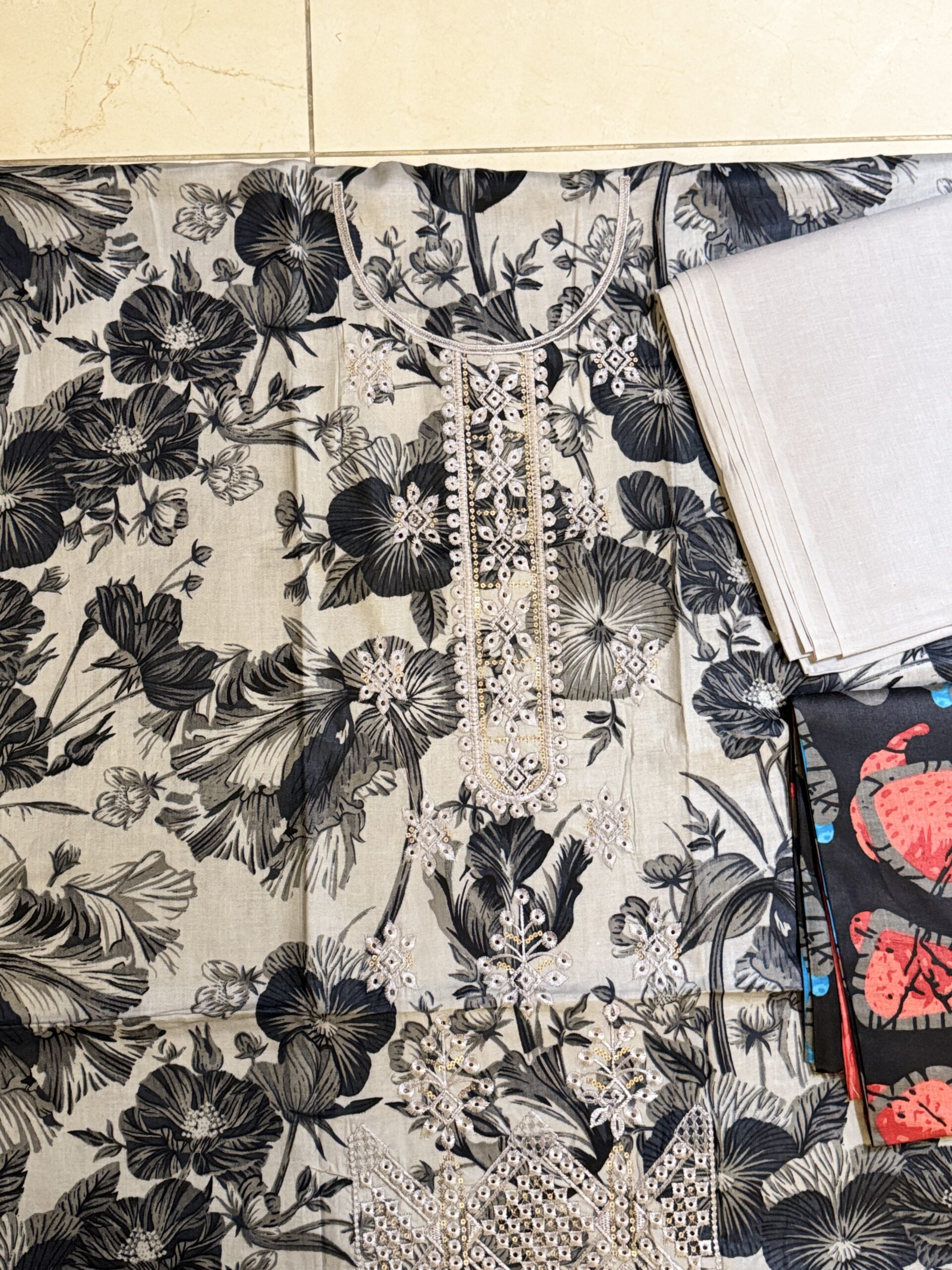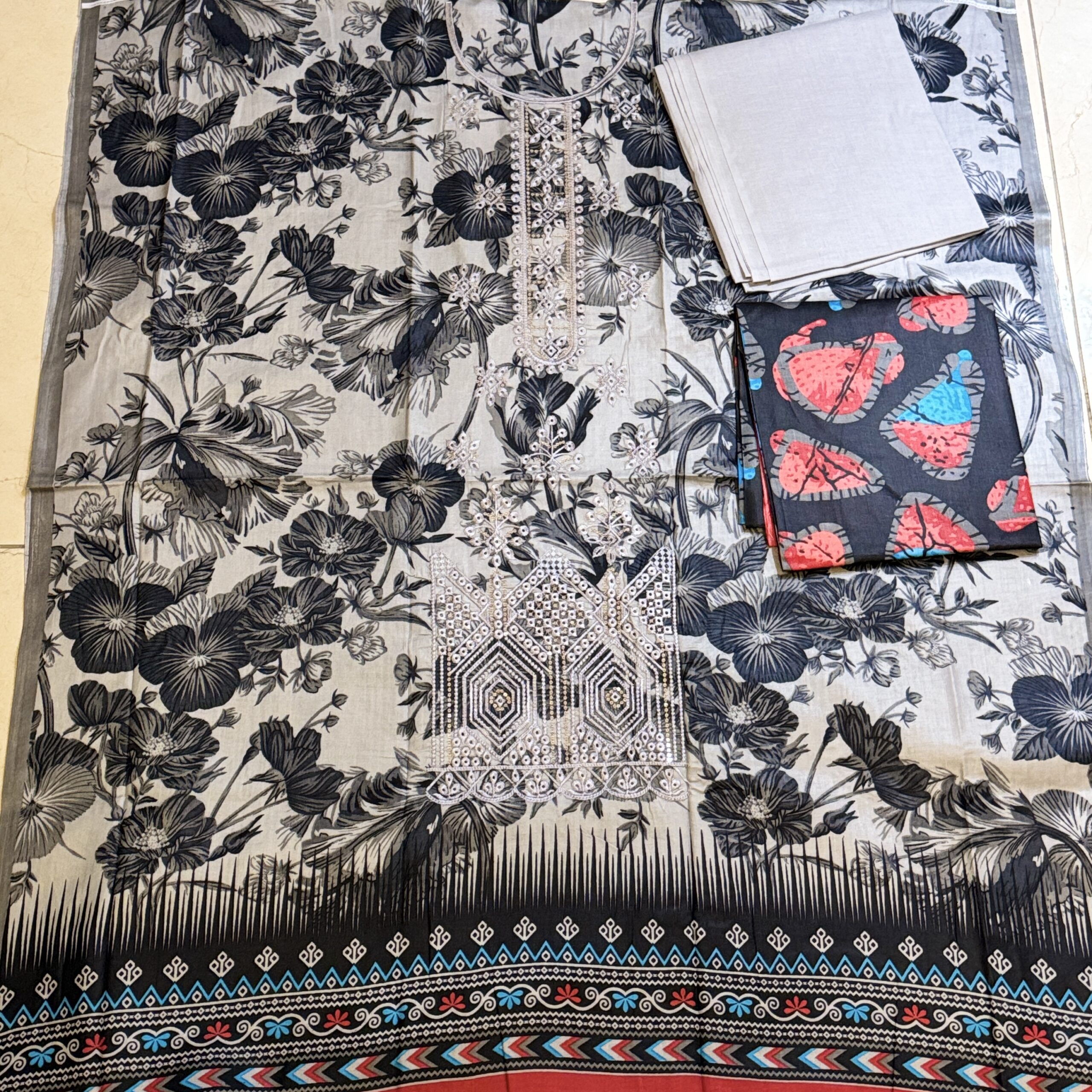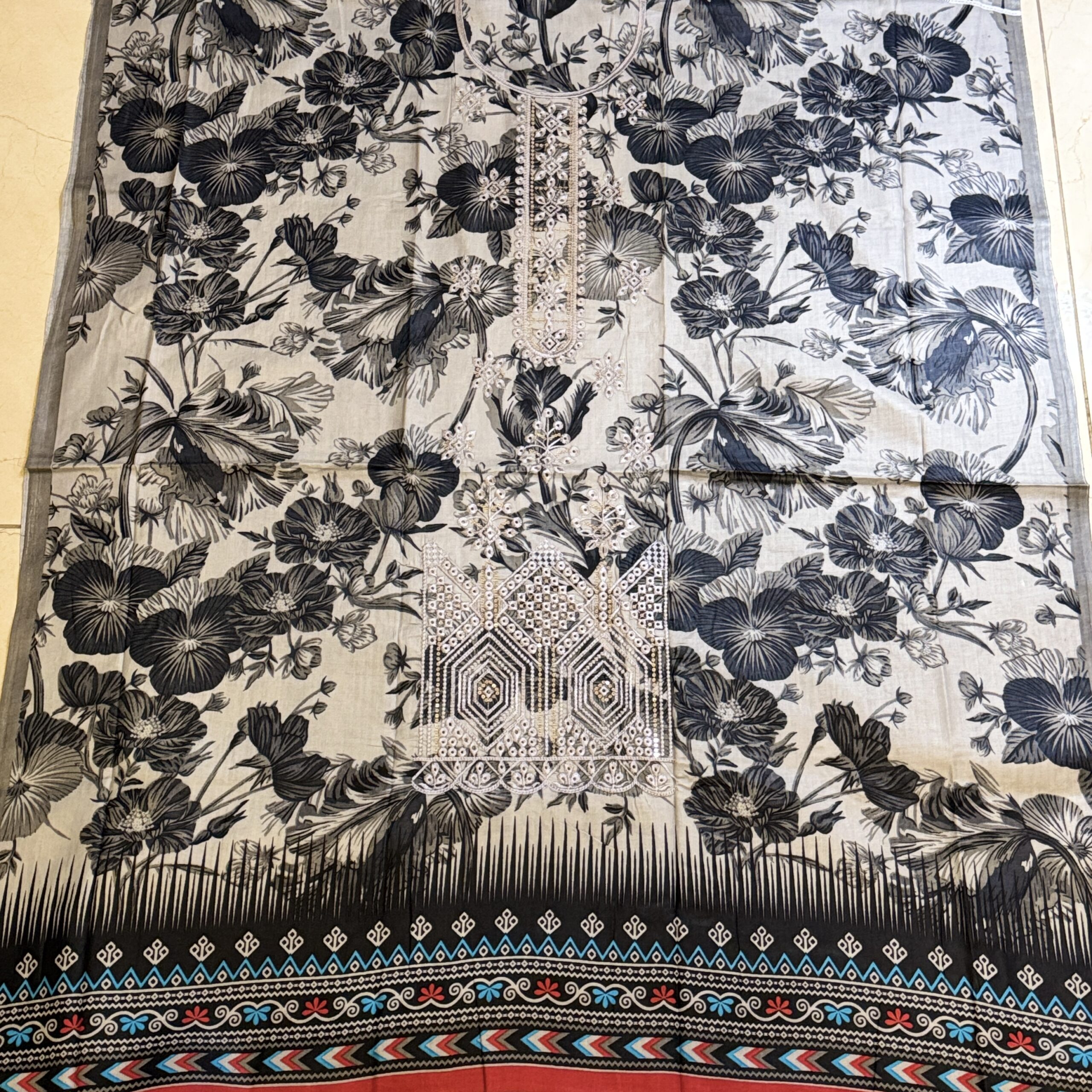 • Colour: Black, Grey & Off-White (with Gold/Beige Embroidery)