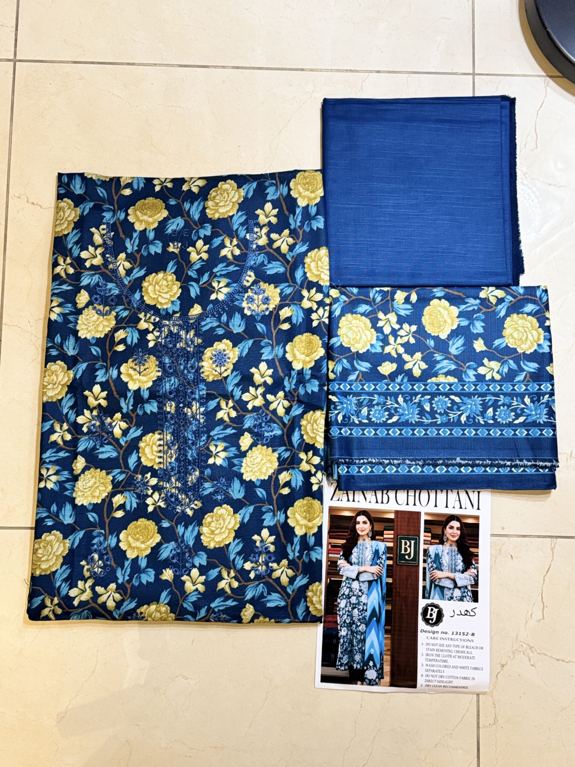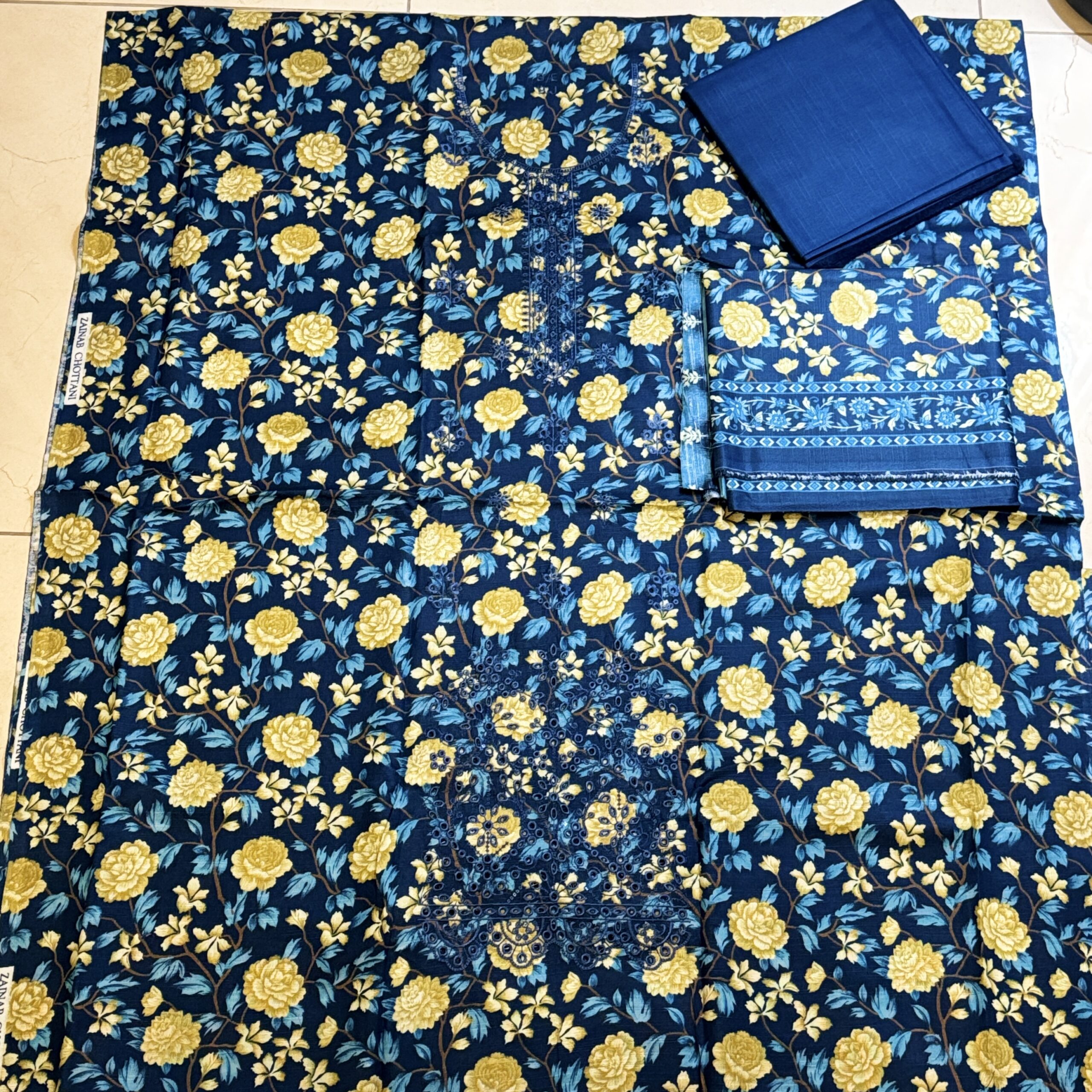 Trouser: Khaddar 3 meter solid dyed or printed trouser (coordinates with the base blue)