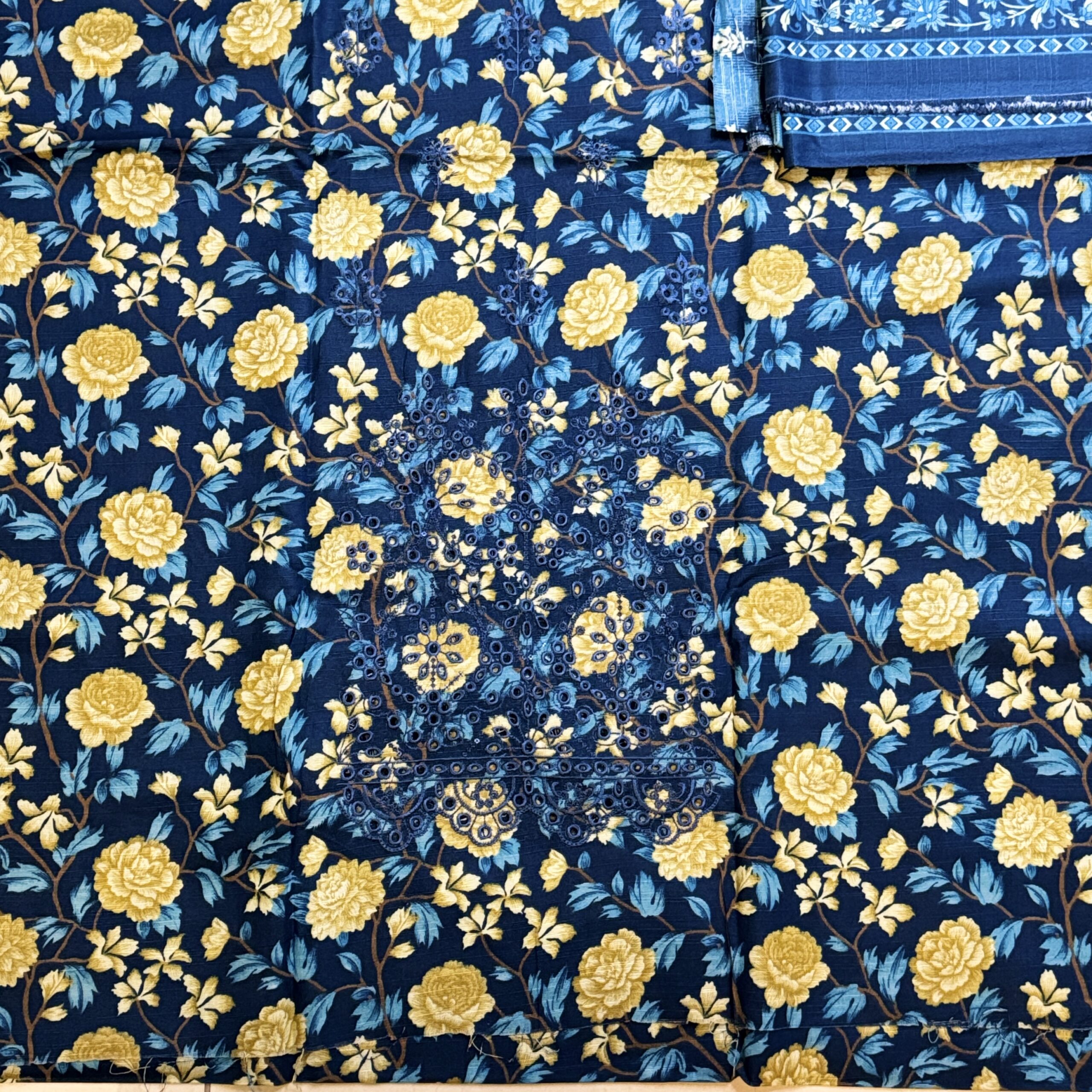 The shirt fabric showcases a beautiful contrast, with a deep Navy/Sapphire Blue background richly adorned with sophisticated Mustard Yellow/Golden floral and botanical prints. The shirt panel includes intricate detailing or subtle embroidery near the neckline, as depicted on the packaging.